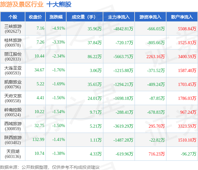 个股表现方面,旅游及景区行业当日领跌股为三峡旅游(002627),该股当日报收7.16,下跌4.91%,成交量35.96万,主力资金净流出4842.81万元。桂林旅游(000978)以下跌3.33%紧随其后,该股当日成交量37.84万,主力资金净流出720.17万元。除此之外,丽江股份(002033)、大连圣亚(600593)、凯撒旅业(000796)均进入当日熊股之列。具体个股列表见下表: