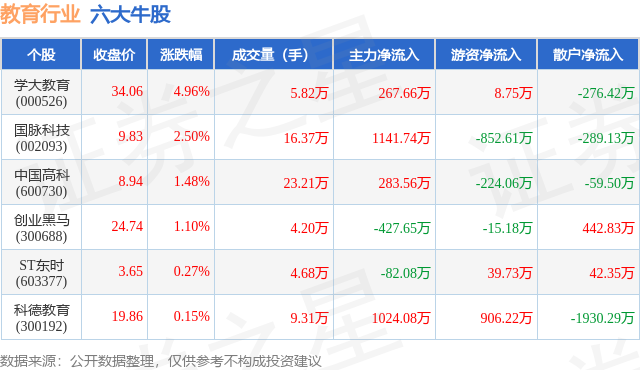 个股表现方面,教育行业当日领涨股为学大教育(000526),该股当日报收34.06,上涨4.96%,成交量5.82万,主力资金净流入267.66万元。国脉科技(002093)以上涨2.5%紧随其后,该股当日成交量16.37万,主力资金净流入1141.74万元。除此之外,中国高科(600730)、创业黑马(300688)、ST东时(603377)均进入当日牛股之列。具体个股列表见下表: