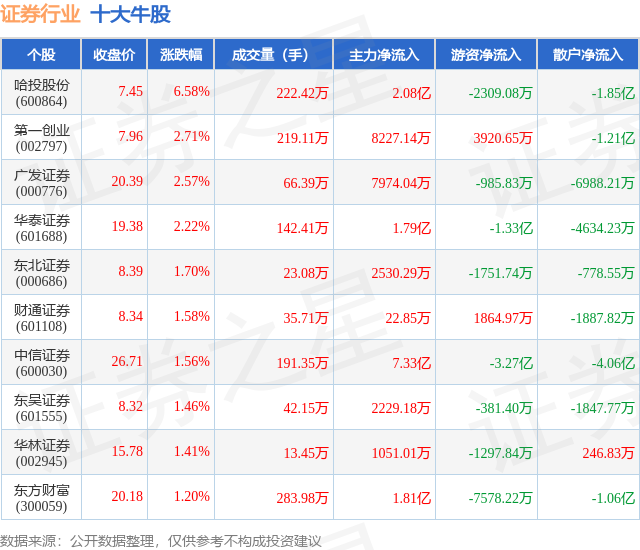 个股表现方面,证券行业当日领涨股为哈投股份(600864),该股当日报收7.45,上涨6.58%,成交量222.42万,主力资金净流入2.08亿元。第一创业(002797)以上涨2.71%紧随其后,该股当日成交量219.11万,主力资金净流入8227.14万元。除此之外,广发证券(000776)、华泰证券(601688)、东北证券(000686)均进入当日牛股之列。具体个股列表见下表: