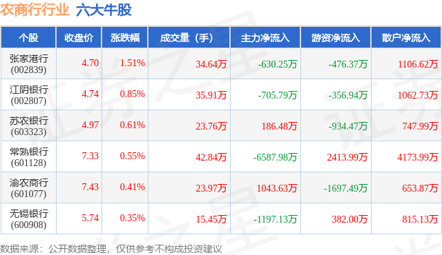 个股表现方面,农商行行业当日领涨股为张家港行(002839),该股当日报收4.7,上涨1.51%,成交量34.64万,主力资金净流出630.25万元。江阴银行(002807)以上涨0.85%紧随其后,该股当日成交量35.91万,主力资金净流出705.79万元。除此之外,苏农银行(603323)、常熟银行(601128)、渝农商行(601077)均进入当日牛股之列。具体个股列表见下表: