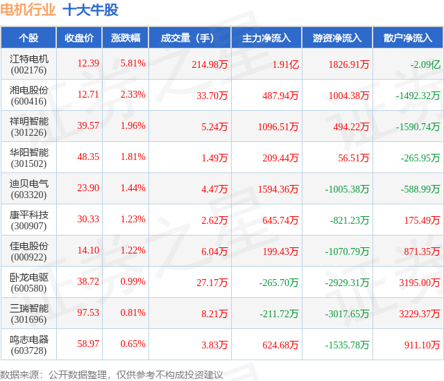 个股表现方面,电机行业当日领涨股为江特电机(002176),该股当日报收12.39,上涨5.81%,成交量214.98万,主力资金净流入1.91亿元。湘电股份(600416)以上涨2.33%紧随其后,该股当日成交量33.7万,主力资金净流入487.94万元。除此之外,祥明智能(301226)、华阳智能(301502)、迪贝电气(603320)均进入当日牛股之列。具体个股列表见下表: