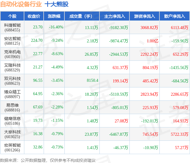个股表现方面,自动化设备行业当日领跌股为科捷智能(688455),该股当日报收23.7,下跌16.4%,成交量13.11万,主力资金净流出9182.3万元。安达智能(688125)以下跌9.24%紧随其后,该股当日成交量2.18万,主力资金净流出9874.47万元。除此之外,克来机电(603960)、艾隆科技(688329)、双元科技(688623)均进入当日熊股之列。具体个股列表见下表: