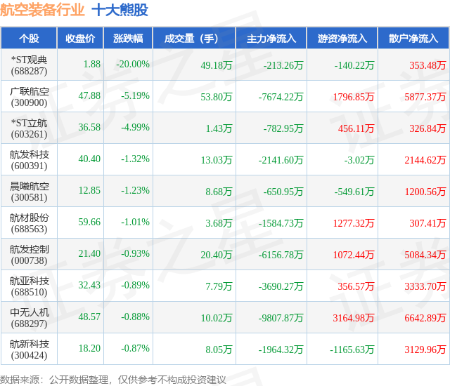 个股表现方面,航空装备行业当日领跌股为*ST观典(688287),该股当日报收1.88,下跌20.0%,成交量49.18万,主力资金净流出213.26万元。广联航空(300900)以下跌5.19%紧随其后,该股当日成交量53.8万,主力资金净流出7674.22万元。除此之外,*ST立航(603261)、航发科技(600391)、晨曦航空(300581)均进入当日熊股之列。具体个股列表见下表: