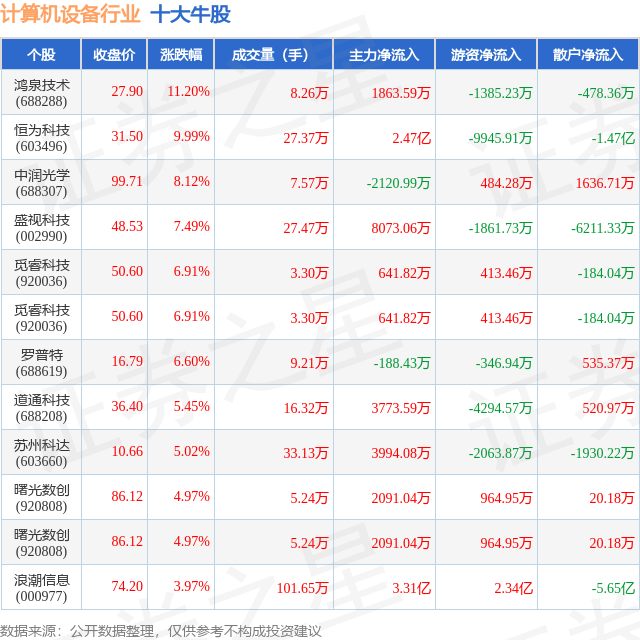 个股表现方面,计算机设备行业当日领涨股为鸿泉技术(688288),该股当日报收27.9,上涨11.2%,成交量8.26万,主力资金净流入1863.59万元。恒为科技(603496)以上涨9.99%紧随其后,该股当日成交量27.37万,主力资金净流入2.47亿元。除此之外,中润光学(688307)、盛视科技(002990)、觅睿科技(920036)均进入当日牛股之列。具体个股列表见下表:
