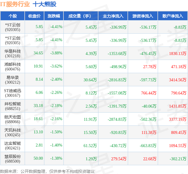 个股表现方面,IT服务行业当日领跌股为*ST云创(920305),该股当日报收5.85,下跌4.41%,成交量5.45万,主力资金净流出336.99万元。*ST云创(920305)以下跌4.41%紧随其后,该股当日成交量5.45万,主力资金净流出336.99万元。除此之外,华是科技(301218)、湘邮科技(600476)、易华录(300212)均进入当日熊股之列。具体个股列表见下表: