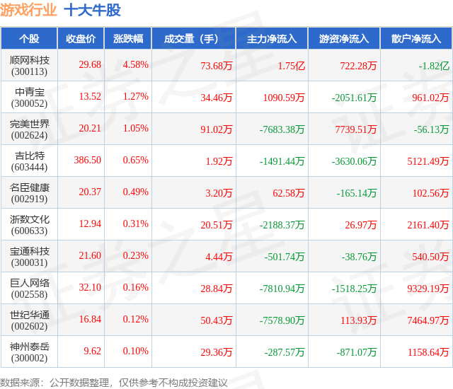 个股表现方面,游戏行业当日领涨股为顺网科技(300113),该股当日报收29.68,上涨4.58%,成交量73.68万,主力资金净流入1.75亿元。中青宝(300052)以上涨1.27%紧随其后,该股当日成交量34.46万,主力资金净流入1090.59万元。除此之外,完美世界(002624)、吉比特(603444)、名臣健康(002919)均进入当日牛股之列。具体个股列表见下表: