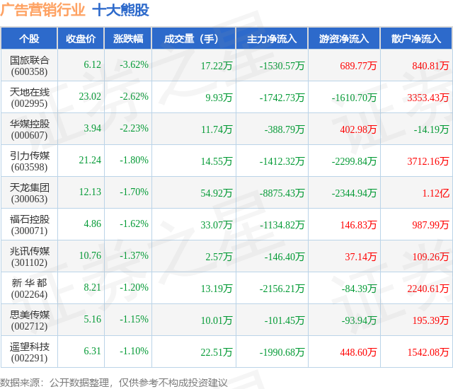 个股表现方面,广告营销行业当日领跌股为国旅联合(600358),该股当日报收6.12,下跌3.62%,成交量17.22万,主力资金净流出1530.57万元。天地在线(002995)以下跌2.62%紧随其后,该股当日成交量9.93万,主力资金净流出1742.73万元。除此之外,华媒控股(000607)、引力传媒(603598)、天龙集团(300063)均进入当日熊股之列。具体个股列表见下表: