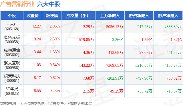 个股表现方面,广告营销行业当日领涨股为三人行(605168),该股当日报收42.27,上涨2.95%,成交量12.29万,主力资金净流入5056.13万元。蓝色光标(300058)以上涨2.39%紧随其后,该股当日成交量579.85万,主力资金净流出3.26亿元。除此之外,纵横通信(603602)、浙文互联(600986)、旗天科技(300061)均进入当日牛股之列。具体个股列表见下表: