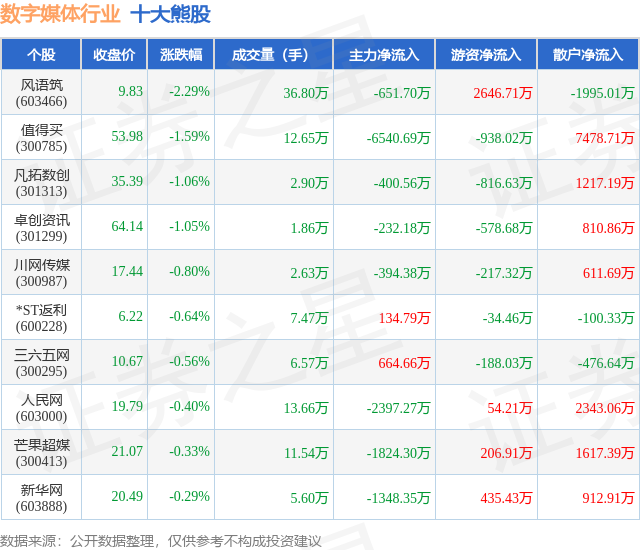 个股表现方面,数字媒体行业当日领跌股为风语筑(603466),该股当日报收9.83,下跌2.29%,成交量36.8万,主力资金净流出651.7万元。值得买(300785)以下跌1.59%紧随其后,该股当日成交量12.65万,主力资金净流出6540.69万元。除此之外,凡拓数创(301313)、卓创资讯(301299)、川网传媒(300987)均进入当日熊股之列。具体个股列表见下表: