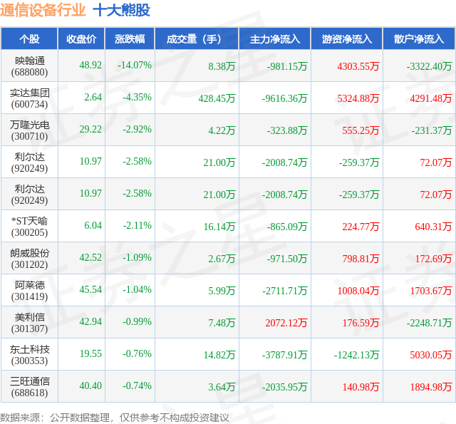 个股表现方面,通信设备行业当日领跌股为映翰通(688080),该股当日报收48.92,下跌14.07%,成交量8.38万,主力资金净流出981.15万元。实达集团(600734)以下跌4.35%紧随其后,该股当日成交量428.45万,主力资金净流出9616.36万元。除此之外,万隆光电(300710)、利尔达(920249)、利尔达(920249)均进入当日熊股之列。具体个股列表见下表: