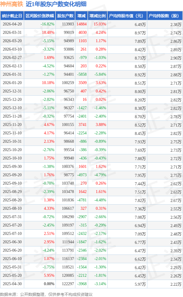 证券之星消息,近日神州高铁披露,截至2026年4月20日公司股东户数为11.39万户,较3月31日增加1.49万户,增幅为15.03%。户均持股数量由上期的2.74万股减少至2.38万股,户均持股市值为6.49万元。