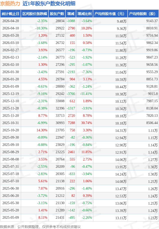 从股价来看,2026年4月10日至2026年4月20日,京能热力区间跌幅为2.35%,在此期间股东户数减少1088.0户,减幅为3.64%。
