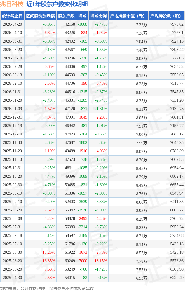 从股价来看,2026年4月10日至2026年4月20日,兆日科技区间跌幅为3.06%,在此期间股东户数减少1068.0户,减幅为2.47%。