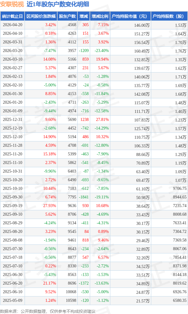 证券之星消息,近日安联锐视披露,截至2026年4月20日公司股东户数为4568.0户,较4月10日增加305.0户,增幅为7.15%。户均持股数量由上期的1.64万股减少至1.53万股,户均持股市值为146.0万元。