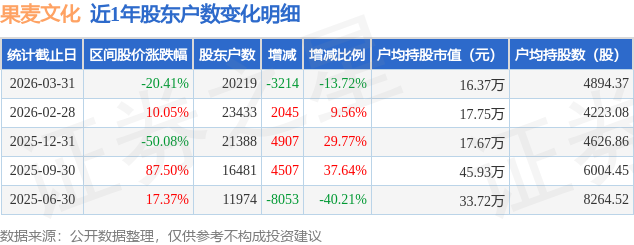 从股价来看,2026年2月28日至2026年3月31日,果麦文化区间跌幅为20.41%,在此期间股东户数减少3214.0户,减幅为13.72%。