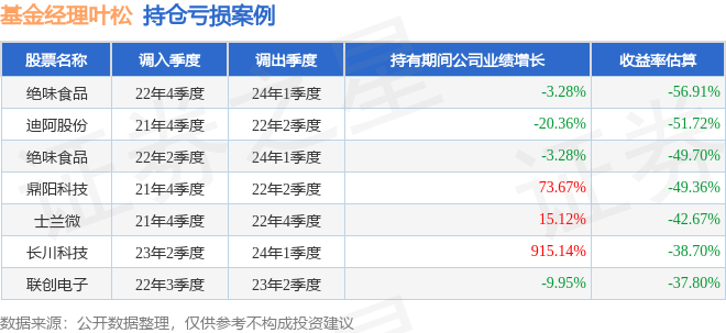 叶松管理的长信优质企业混合A基金在22年4季度买入绝味食品,在持有1年又1个季度后在24年1季度卖出。持有期间的估算收益率为-56.91%,持有期间绝味食品在2022年到2024年的年报归属净利润降幅为3.28%。