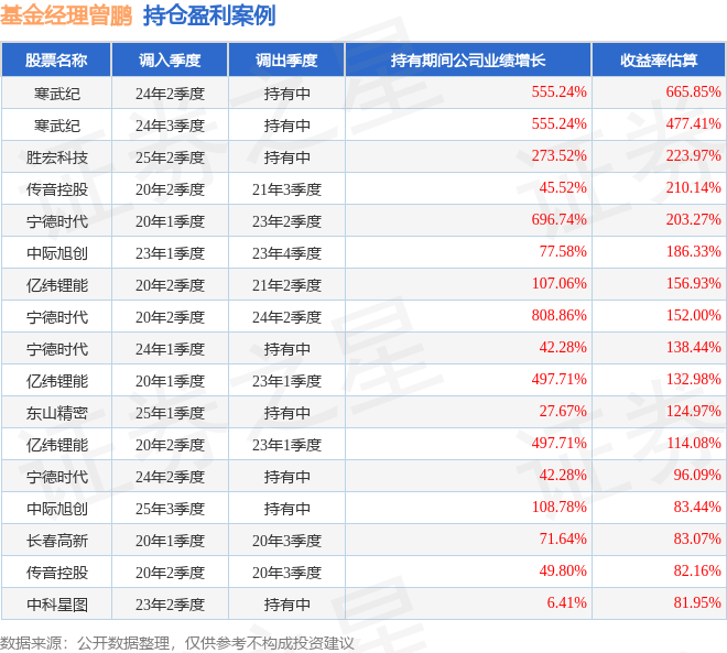 曾鹏管理的博时沪港深优质企业基金A基金在24年2季度买入寒武纪,已连续持有1年又3个季度。持有期间的估算收益率为665.85%,持有期间寒武纪在2024年到2025年的年报归属净利润增幅达555.24%。
