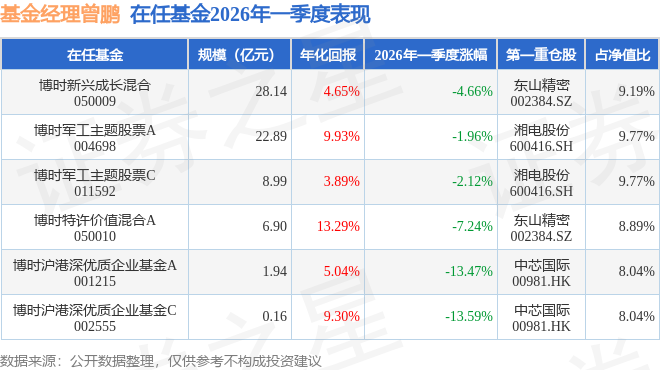 证券之星消息,截止2026年一季度末,基金经理曾鹏旗下共管理6只基金,本季度表现最佳的为博时军工主题股票A(004698),季度净值跌1.96%。