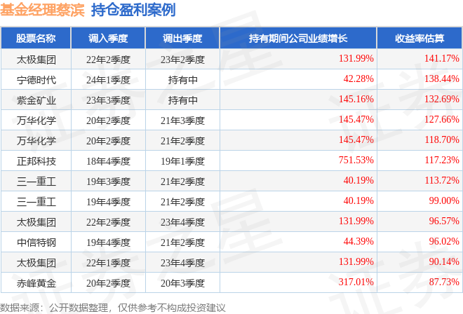 蔡滨管理的博时产业精选混合A基金在22年2季度买入太极集团,在持有1年又0个季度后在23年2季度卖出。持有期间的估算收益率为141.17%,持有期间太极集团在2022年到2023年的年报归属净利润增幅达131.99%。