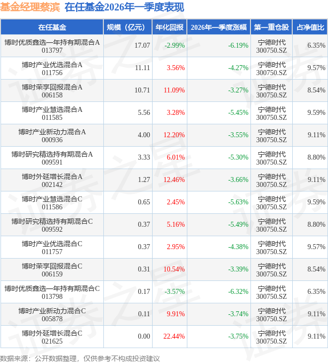 证券之星消息,截止2026年一季度末,基金经理蔡滨旗下共管理14只基金,本季度表现最佳的为博时荣享回报混合A(006158),季度净值跌3.27%。