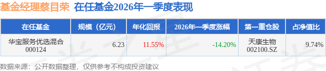 证券之星消息,截止2026年一季度末,基金经理蔡目荣管理的华宝服务优选混合(000124)季度净值跌14.2%。