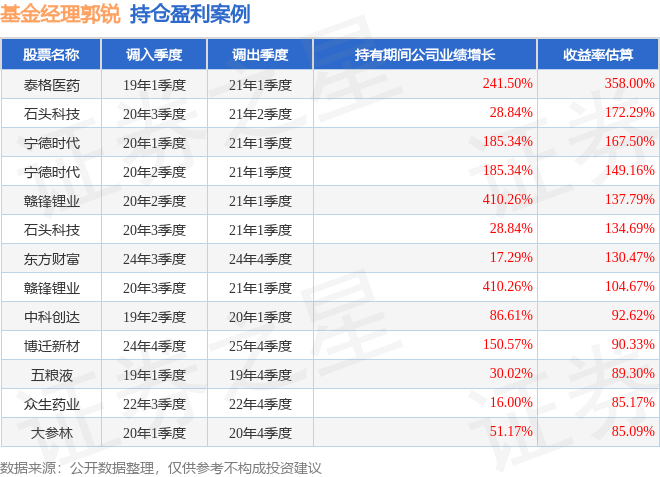 郭锐管理的招商核心价值混合基金在19年1季度买入泰格医药,在持有2年又0个季度后在21年1季度卖出。持有期间的估算收益率为358%,持有期间泰格医药在2019年到2021年的年报归属净利润增幅达241.5%。