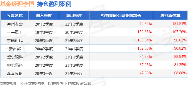 李恒管理的国泰景气行业灵活配置混合基金在20年3季度买入宁德时代,在持有3个季度后在21年2季度卖出。持有期间的估算收益率为96.62%,持有期间宁德时代在2020年到2021年的年报归属净利润增幅达185.34%。
