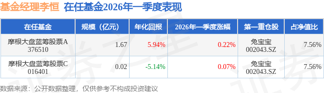 证券之星消息,截止2026年一季度末,基金经理李恒旗下共管理2只基金,本季度表现最佳的为摩根大盘蓝筹股票A(376510),季度净值涨0.22%。