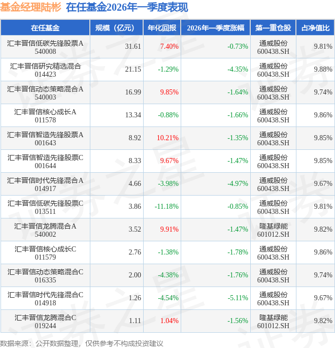证券之星消息,截止2026年一季度末,基金经理陆彬旗下共管理13只基金,本季度表现最佳的为汇丰晋信低碳先锋股票A(540008),季度净值跌0.73%。