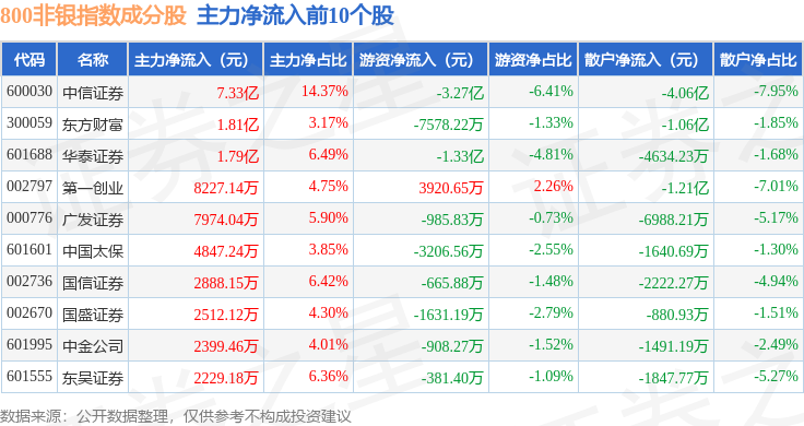 资金流向方面,800非银(399966)指数成份股当日主力资金净流入合计7.32亿元,游资资金净流出合计4.48亿元,散户资金净流出合计2.83亿元。成份股资金流向详情见下表: