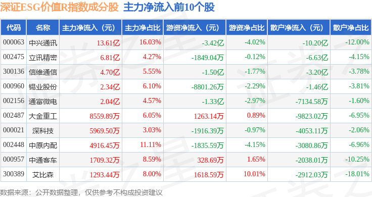 资金流向方面,深证ESG价值R(470061)指数成份股当日主力资金净流入合计17.14亿元,游资资金净流出合计6.2亿元,散户资金净流出合计10.93亿元。成份股资金流向详情见下表: