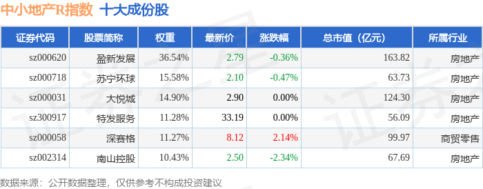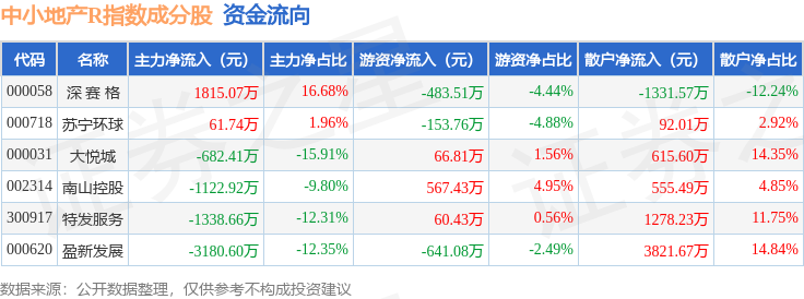 资金流向方面,中小地产R(471002)指数成份股当日主力资金净流出合计4447.77万元,游资资金净流出合计583.67万元,散户资金净流入合计5031.45万元。成份股资金流向详情见下表: