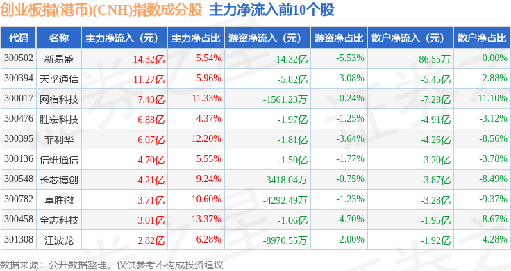 资金流向方面,创业板指(港币)(CNH)(970006)指数成份股当日主力资金净流入合计34.27亿元,游资资金净流出合计15.86亿元,散户资金净流出合计18.41亿元。成份股资金流向详情见下表: