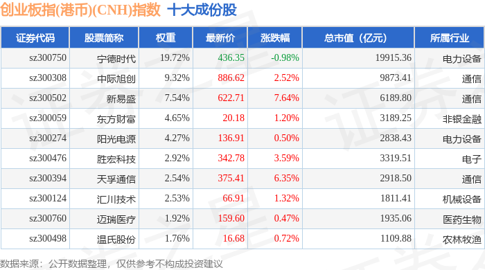 创业板指(港币)(CNH)(970006)指数十大成份股详情如下: