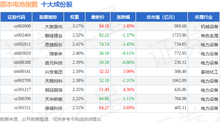 固态电池(980140)指数十大成份股详情如下: