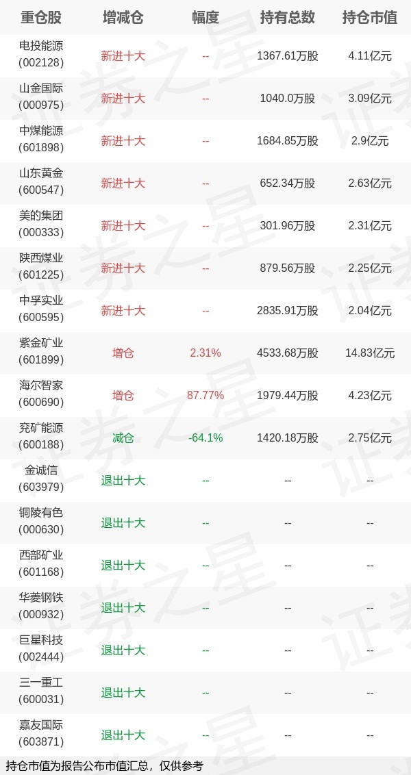 证券之星消息,4月22日景顺长城基金旗下李怡文 邹立虎 李曾卓卓管理的景顺长城景盛双息收益债券型基金公布一季报,近1年净值增长率11.22%。与上一季度相比,该基金前十大重仓股新增电投能源,山金国际,中煤能源,山东黄金,美的集团,陕西煤业,中孚实业;并对紫金矿业增仓102.27万股,为该基金第一大重仓股;金诚信,铜陵有色,西部矿业,华菱钢铁,巨星科技,三一重工,嘉友国际等退出前十大重仓股;详细数据如下: