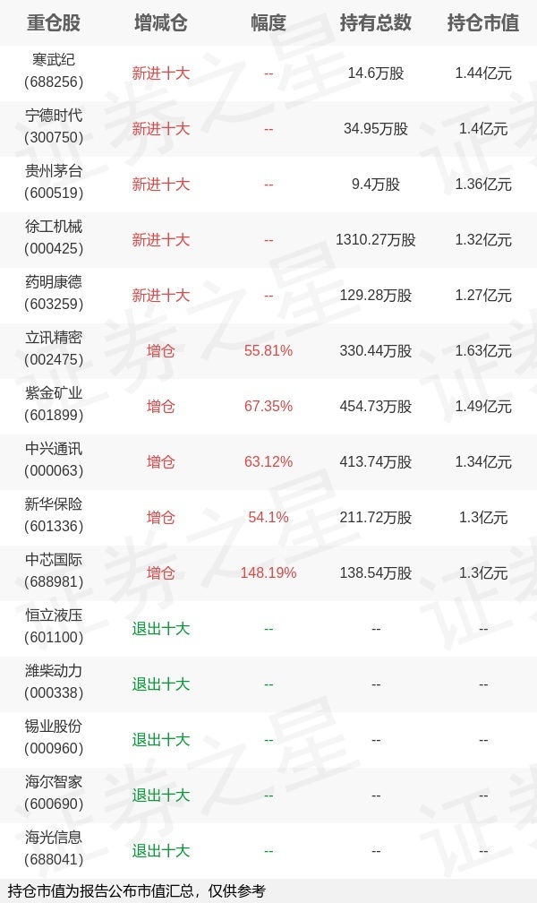证券之星消息,4月22日景顺长城基金旗下陈静 王勇管理的景顺长城景盈双利债券型基金公布一季报,近1年净值增长率11.11%。与上一季度相比,该基金前十大重仓股新增寒武纪,宁德时代,贵州茅台,徐工机械,药明康德;并对立讯精密增仓118.36万股,为该基金第一大重仓股;恒立液压,潍柴动力,锡业股份,海尔智家,海光信息等退出前十大重仓股;详细数据如下: