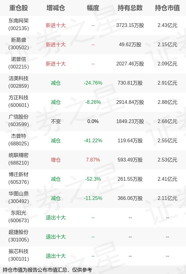 证券之星消息,4月22日华夏基金旗下钟帅管理的华夏行业景气混合型基金公布一季报,近1年净值增长率94.35%。与上一季度相比,该基金前十大重仓股新增东南网架,新易盛,诺普信;其中洁美科技持仓占比2.99%,为该基金第一大重仓股;东阳光,超捷股份,振芯科技等退出前十大重仓股;详细数据如下: