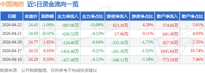 证券之星消息,截至2026年4月22日收盘,中国海防(600764)报收于24.42元,下跌1.09%,换手率0.57%,成交量4.06万手,成交额9896.28万元。