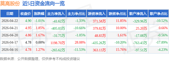 证券之星消息,截至2026年4月22日收盘,莫高股份(600543)报收于4.9元,下跌1.01%,换手率1.97%,成交量6.34万手,成交额3136.05万元。