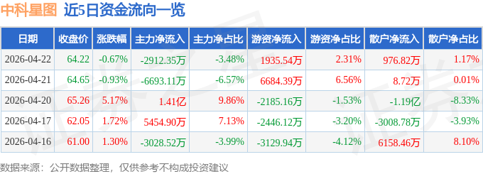 证券之星消息,截至2026年4月22日收盘,中科星图(688568)报收于64.22元,下跌0.67%,换手率1.62%,成交量13.08万手,成交额8.37亿元。