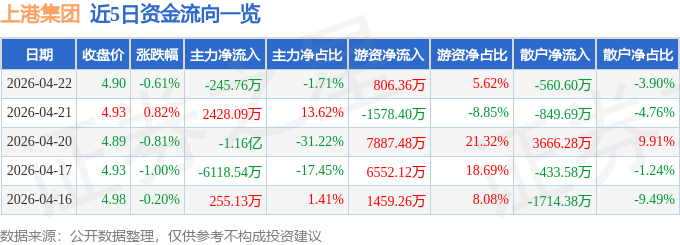 证券之星消息,截至2026年4月22日收盘,上港集团(600018)报收于4.9元,下跌0.61%,换手率0.13%,成交量29.26万手,成交额1.44亿元。