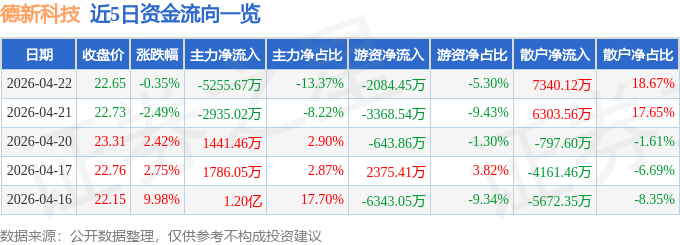 证券之星消息,截至2026年4月22日收盘,德新科技(603032)报收于22.65元,下跌0.35%,换手率7.5%,成交量17.37万手,成交额3.93亿元。