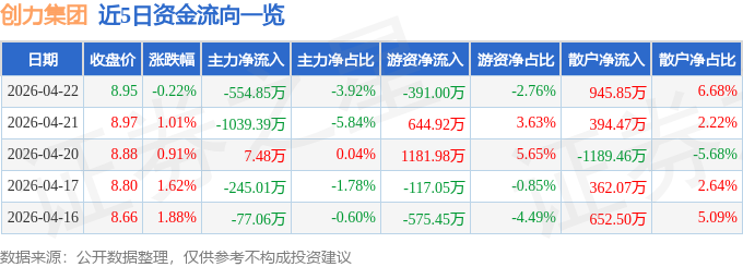 证券之星消息,截至2026年4月22日收盘,创力集团(603012)报收于8.95元,下跌0.22%,换手率2.46%,成交量15.87万手,成交额1.42亿元。