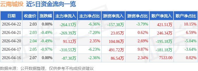 证券之星消息,截至2026年4月22日收盘,云南城投(600239)报收于2.03元,上涨0.0%,换手率1.27%,成交量20.41万手,成交额4150.97万元。