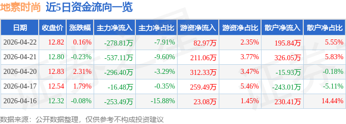 证券之星消息,截至2026年4月22日收盘,地素时尚(603587)报收于12.82元,上涨0.16%,换手率0.58%,成交量2.75万手,成交额3525.51万元。