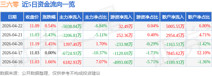 证券之星消息,截至2026年4月22日收盘,三六零(601360)报收于11.09元,上涨0.54%,换手率0.95%,成交量66.8万手,成交额7.36亿元。