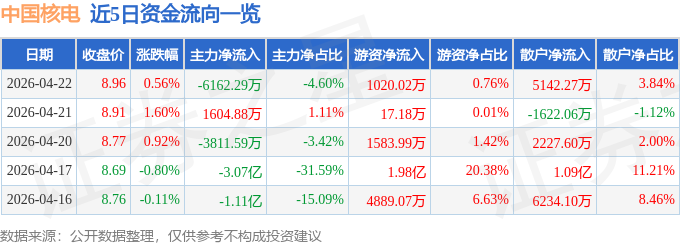 证券之星消息,截至2026年4月22日收盘,中国核电(601985)报收于8.96元,上涨0.56%,换手率0.79%,成交量149.63万手,成交额13.4亿元。