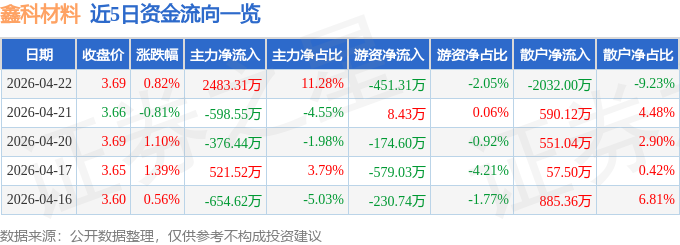 证券之星消息,截至2026年4月22日收盘,鑫科材料(600255)报收于3.69元,上涨0.82%,换手率3.3%,成交量59.67万手,成交额2.2亿元。