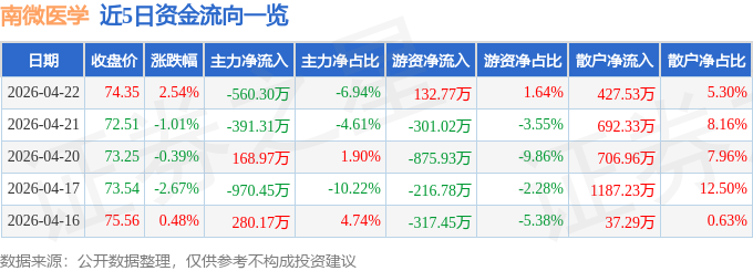 证券之星消息,截至2026年4月22日收盘,南微医学(688029)报收于74.35元,上涨2.54%,换手率0.58%,成交量1.09万手,成交额8072.92万元。